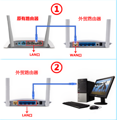 一、首先你要看看你有没有插对网线,用一根网线连接VPN跨境路由器的WAN口和你本来在正常使用的普通企业或家庭路由的其中一个LAN口。注意普通路由的LAN口一般有四个,同颜色的四个口是LAN口。具体最简单的接线方法如下图: